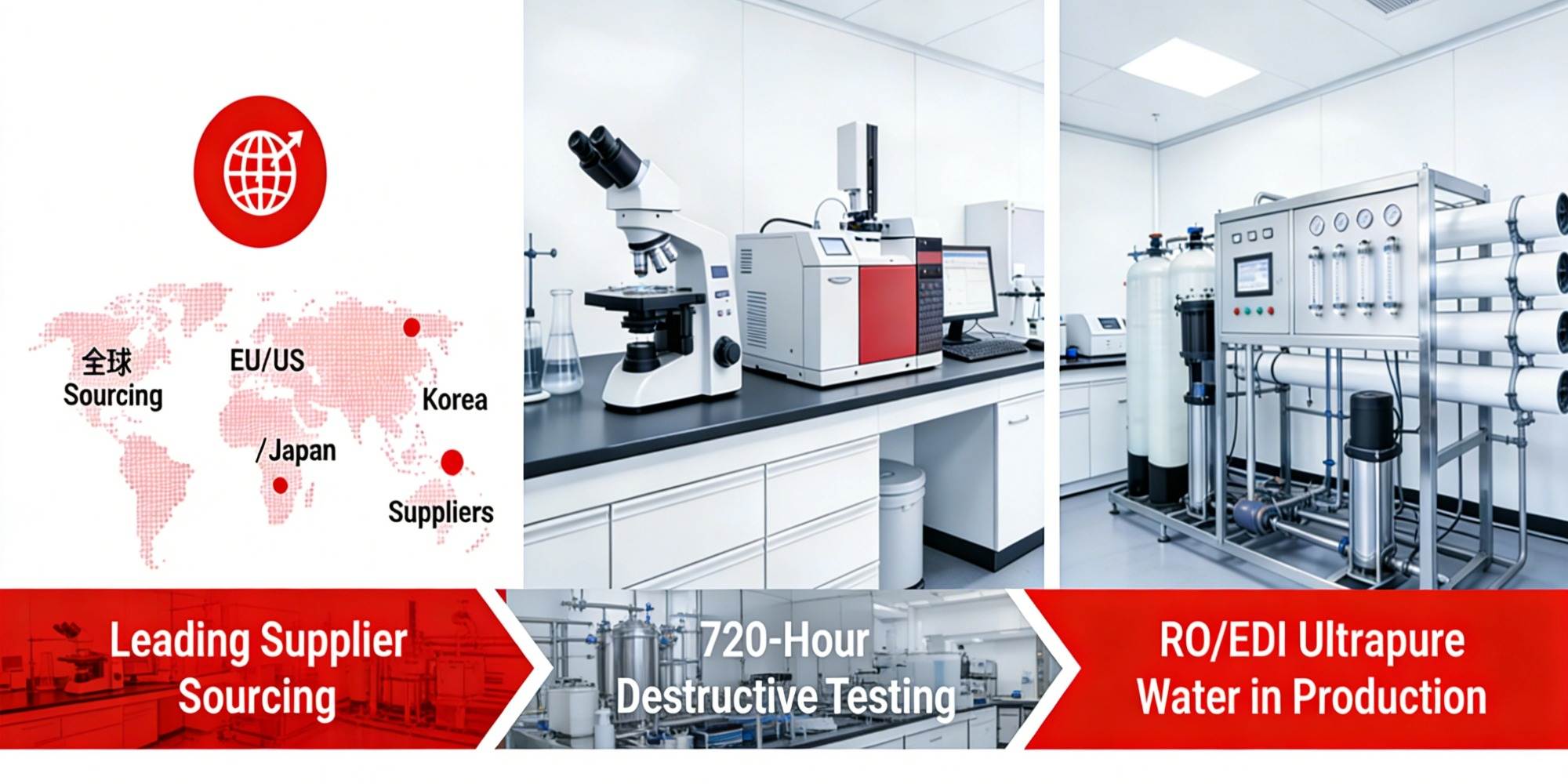 Благодаря глобальным закупкам у ведущих поставщиков из ЕС, США, Японии и Кореи, собственным лабораториям, проводящим 720-часовые разрушающие испытания, и использованию сверхчистой воды, очищенной методом обратного осмоса и электрораспыления, на протяжении всего производственного процесса, мы обеспечиваем качество сырья, безопасность продукции и стабильность рецептуры.